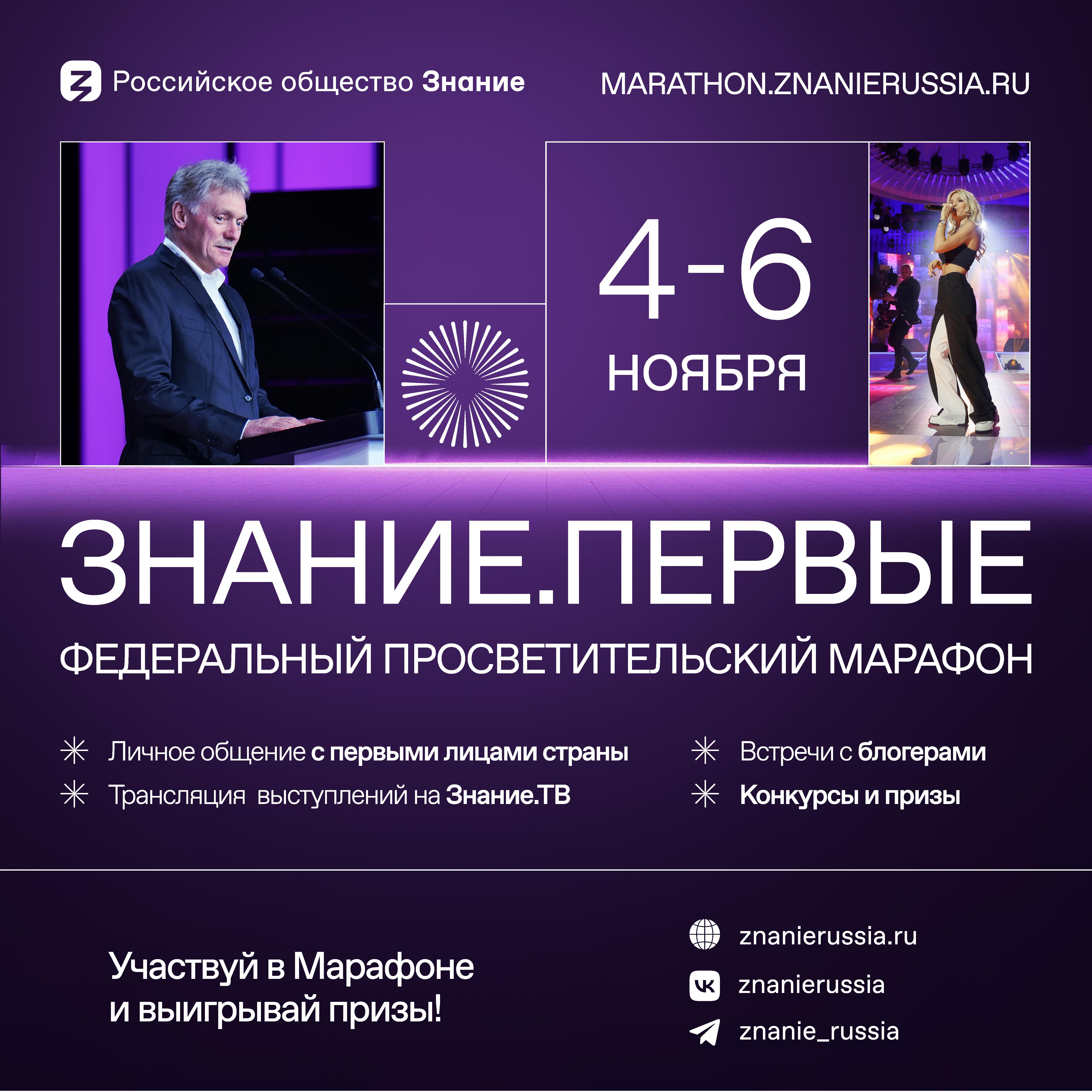 Российское общество «Знание» подготовило для тебя самый масштабный просветительский Марафон Знание.Первые, который стартует в день открытия Международной выставки-форума «Россия» и пройдет с 4 по 6 ноября на ВДНХ в Москве.